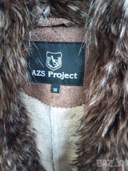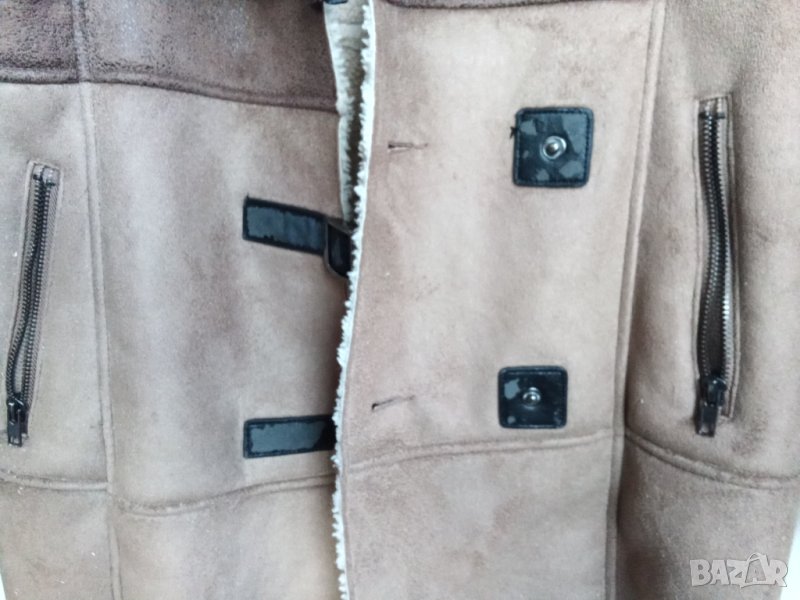 Кожухчето е комбинация от естествени и изкуствени материали според мен.Много е зпазено,с хубава топла подплата.Вижда се на снимките изтритото по закопчалките.Дрехата е за слаба фигура,