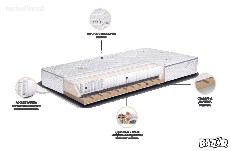 ✓ Ядро: 7-зонова мултипокет пружинна система, полиуретанова Body Care™ пяна, дървена рамка, филц
