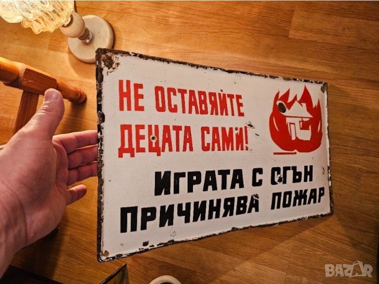 Рядка голяма емайлирана табела НЕ ОСТАВЯЙТЕ ДЕЦАТА САМИ! ИГРАТА С ОГЪН ПРИЧИНЯВА ПОЖАР от 80те