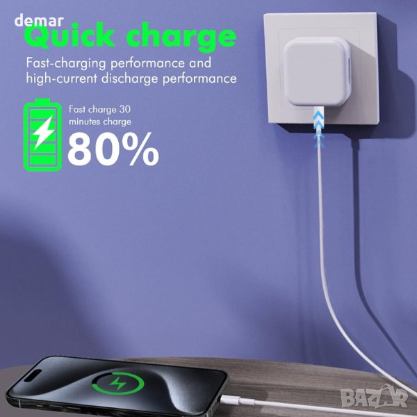 Бързо зарядно устройство, съвместимо с iPhone 15/15 Plus/15 Pro/15 Pro Max/iPad/MacBook Pro и други iOS системи. Това PD бързо зарядно устройство може да доведе вашия iPhone 15 от ниско до 60% само за половин час, изпреварвайки оригиналното 5W зарядно устройство за спестяваща време ефективност. С изключително дълъг кабел от 1,8 метра, това зарядно устройство предлага гъвкавост и удобство, докато неговият материал, забавящ горенето, гарантира безопасност, като предотвратява прегряване и късо съединение. Винаги готово за зареждане, това зарядно устройство е надежден спътник за зареждане в движение.