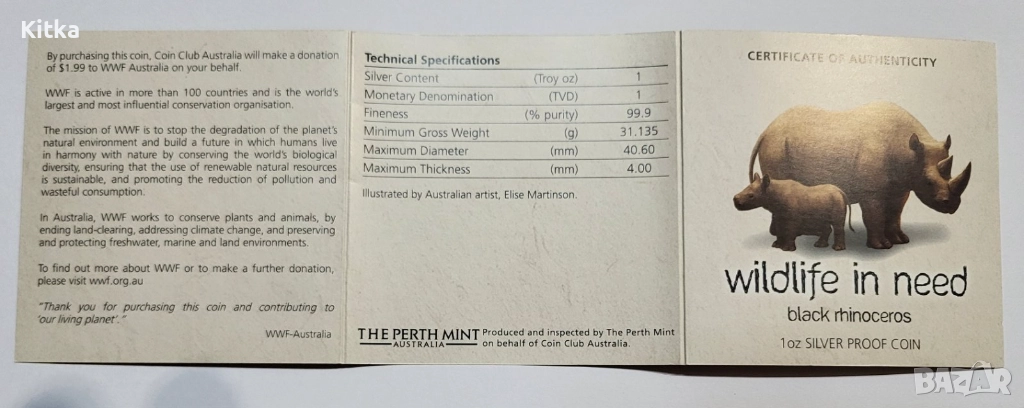 1 унция Носорог 2012 г.- НЕДОКОСВАНА С РЪКА В ОРИГИНАЛНА КАПСУЛА