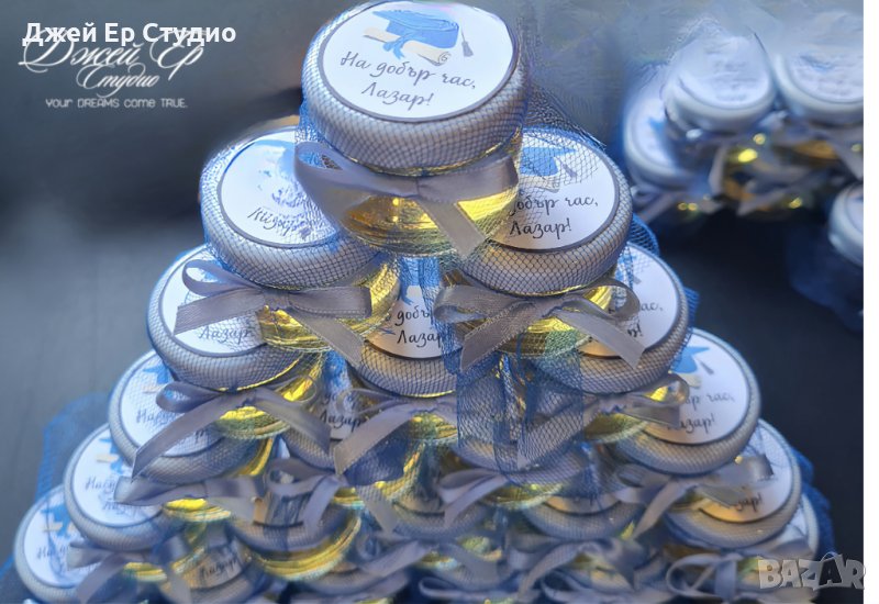 Бурканчетата са с вместимост 30мл. Могат да са подходящи подаръчета за вашите гости, както за абитуриентски бал, така и за сватба, кръщене или рожден ден. Декорациите и цветовете са по ваше желание. Срок на изработка 12 работни дни. Минимално количество за поръчка 10бр.