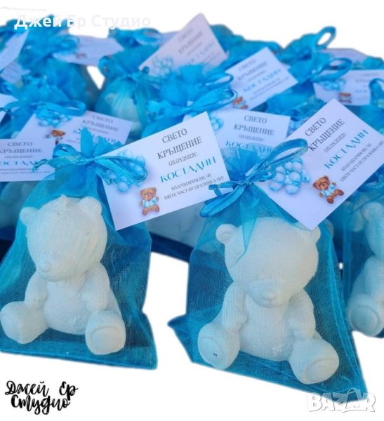 Подаръчета за гости гипсови фигурки мечета, опаковани в торбичка от органза и тагче с датата на вашият празник. Могат да бъдат изработени в цветове по ваш избор. Срок на изработка 12 работни дни. Минимално количество за поръчка 10бр.