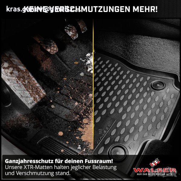 Надеждни стелки за автомобил – в сравнение с универсалната стелка за автомобил, стелките за кола Walser са специално изработени и следователно 100% идеално пасват на пространството на краката ви. Така здравите и издръжливи гумени стелки за кола предлагат най-добрата защита за вашия автомобил във всяка ситуация – независимо дали срещу мръсотия, влага, сняг, нацепване, сол и др. Можете да разчитате на гумените стелки за кола