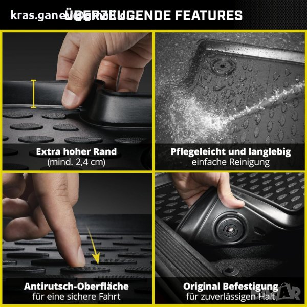Водоустойчиви стелки за автомобил – благодарение на изключително високия ръб (мин. 2,4 см), водоустойчивата стелка за врата улавя течности и замърсявания от всякакъв вид като камъчета, вода, сняг и много други. най-доброто възможно. Благодарение на устойчивия на абразия материал с неплъзгаща се повърхност и оригинално закрепване, гумената стелка остава сигурно на място дори по време на шофиране