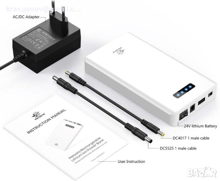 Какво получавате: 1 x 3350 mAh акумулаторна 24 V батерия (5 V порт може да се използва като захранваща банка), 1 x DC5525 щепсел кабел за 24 V изходен порт, 1 x DC4017 щепсел кабел за 9 V изходен порт и 1 x потребител ръководство (английски език не е гарантиран). ★Моля, проверете размера на входния порт на вашето устройство, преди да купите. ★★Моля, имайте предвид, че зарядното е включено. Подходящо е за зареждане със зарядно устройство 29.4V/1A DC/AC).