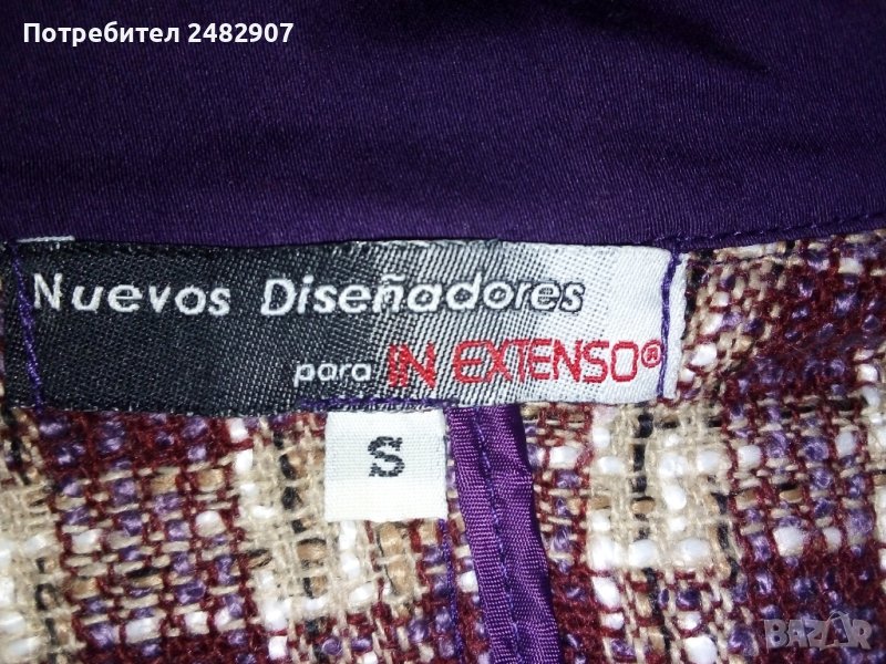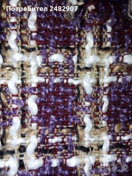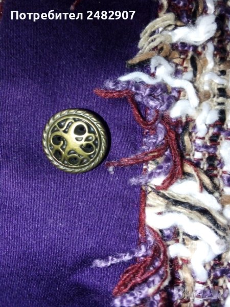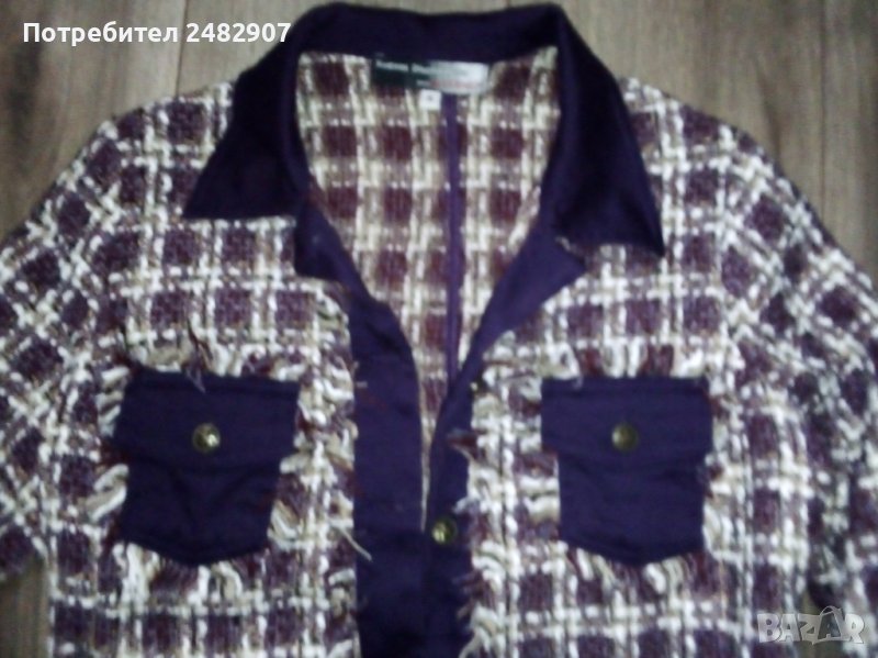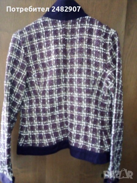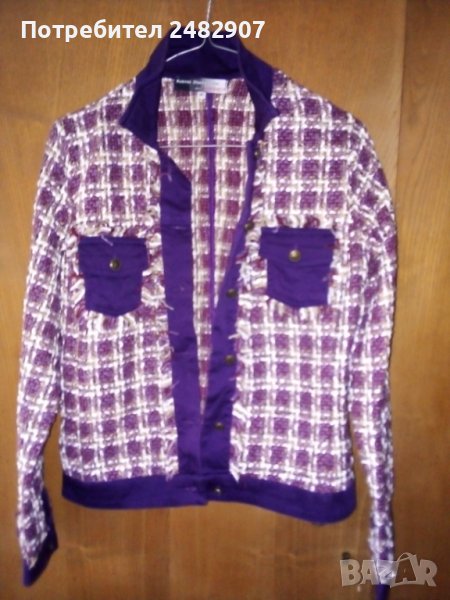 Дамско сако в лилаво, размер S. Ширина в раменете - 35 см, ширина под мишниците - 45 см, ширина в долната част - 44 см, дължина от рамото до долу - 55 см, дължина на ръкава от рамото - 60 см. Много запазено, почти не е използвано, с два малки джоба отпред и закопчаване с 6 броя красиви метални копчета. Същите има на ръкавите и на джобчетата. Отлично състояние, без забележки и без подплата.