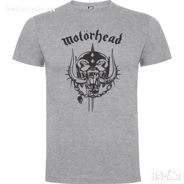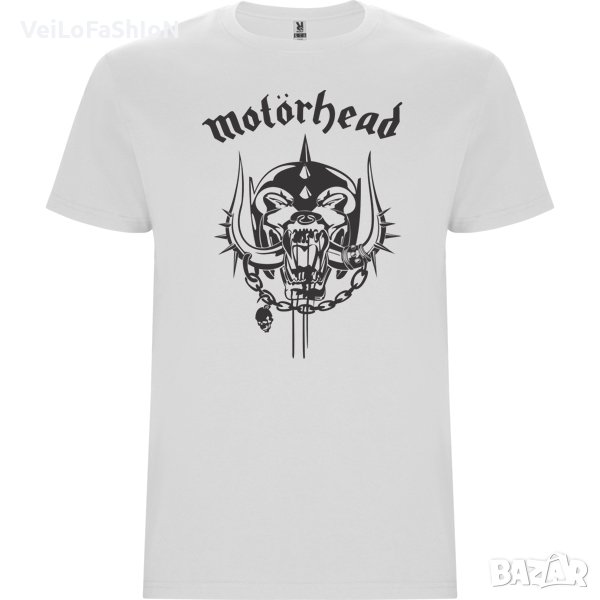 Новa мъжкa тениска в бял или сив цвят на музикалната група Motorhead (Моторхед). Произведена от 100% памук с плътност на тениската 165гр./м². Тениската е странични шевове, четири слойно кръгло деколте и подсилени двойни шевове на деколтето и раменете. Подходяща както за ежедневна употреба, така и за спорт или тренировка в свободното време.