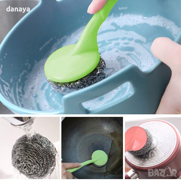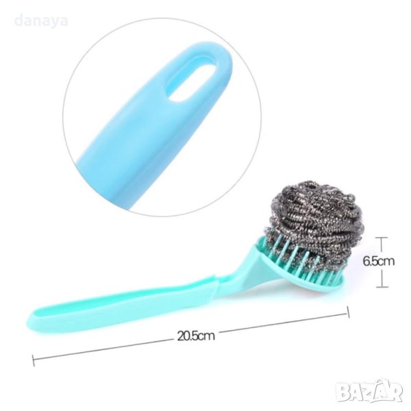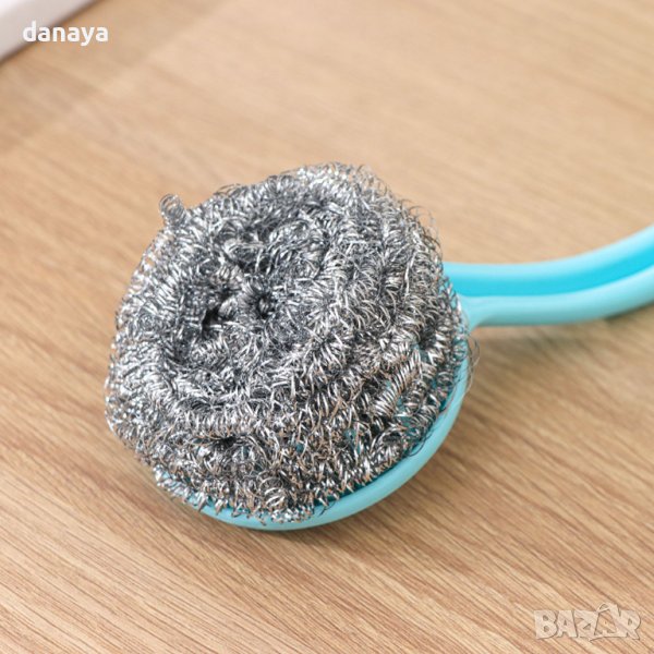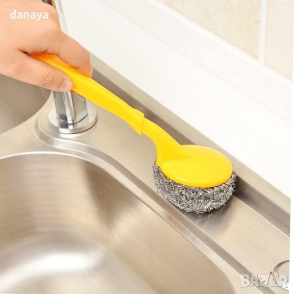 Ефективна четка с дръжка за почистване на кухненски съдове. Четка с дълга дръжка, с която лесно ще почистите мивки, плочки и други повърхности. Перфектна за отстраняване за загорели мазнини и силно замърсени участъци. Телчето се маха от дръжката и може да се подмени с ново, когато се захаби.