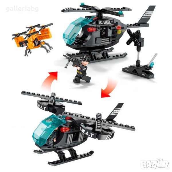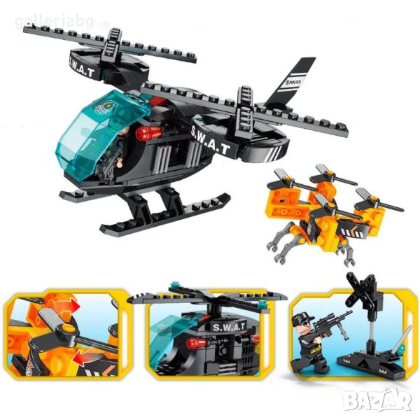 От частите на комплекта можете да сглобите 2 различни хеликоптери, както и квадрокоптер. Хеликоптерът е изработен в черен цвят, а квадрокоптерът е в контрастен оранжев цвят. Отпред е пилотската кабина със синьо предно стъкло, отстрани на хеликоптера има табела с логото на SWAT.
