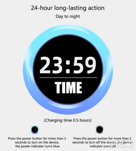 Как да го ползваме? За да включите уреда натиснете и зъдръжте бутона в централната част за поне 2 секунди, като индикаторът светва в синьо и устройството започва да работи. За да изключите - натиснете бутона за поне 2 секунди, докато престане да свети.