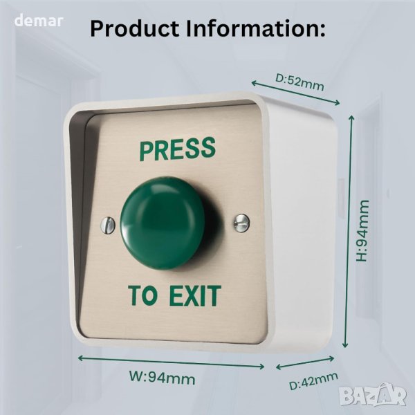 Бутонът SecureMyDoor Outdoor IP65 PRESS TO EXIT е проектиран за издръжливост с рейтинг IP65, за да издържа на тежки външни среди. Той се отличава със здрав дизайн с плоча от полирана неръждаема стомана и корпус от ABS пластмаса, което гарантира, че остава функционален във времето. Този бутон за изход е лесен за инсталиране със своя дизайн за повърхностен монтаж, което го прави съвместим с различни повърхности за безпроблемна настройка. Той предлага гъвкава функционалност с COM-N/O и COM-N/C конфигурации, което го прави съвместим с широка гама от системи за контрол на достъп. Удобният за потребителя механизъм „натисни за излизане“ осигурява лесна употреба за бързи изходи, което го прави идеален избор за търговски, жилищни и индустриални условия.