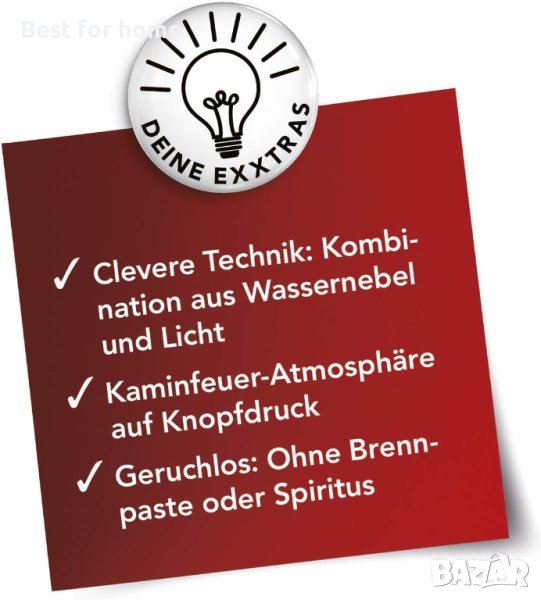 Декоративната камина Maxxmee бързо и лесно създава романтична атмосфера на камина – и без риск от пожар. Пламъците изглеждат измамно истински, но се състоят само от вода, която е пулверизирана от ултразвуков пулверизатор. По този начин не се използват химически вещества и не се разпространява неприятна миризма в дома. В допълнение към визията, декоративната камина Maxxmee има овлажняващ помещението ефект.