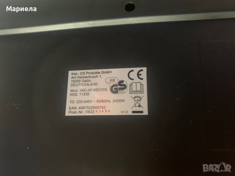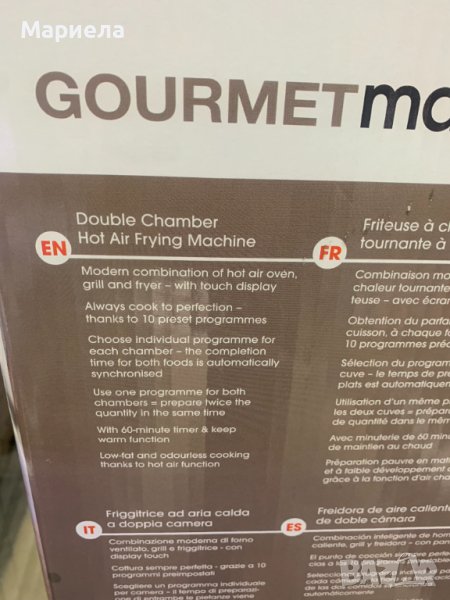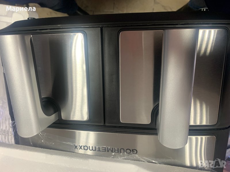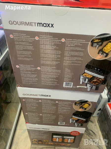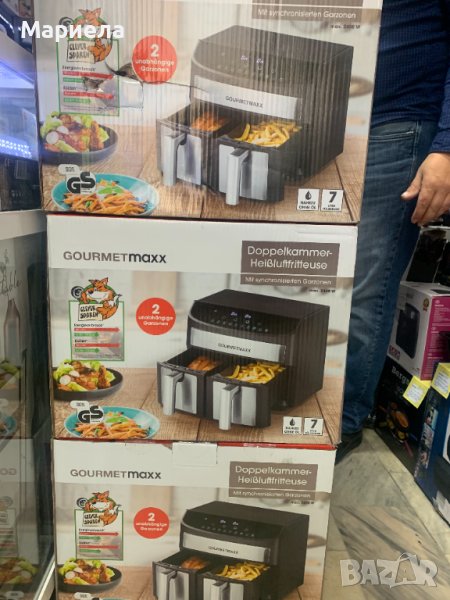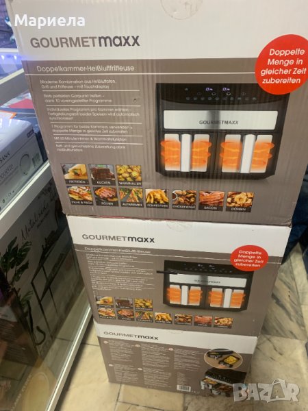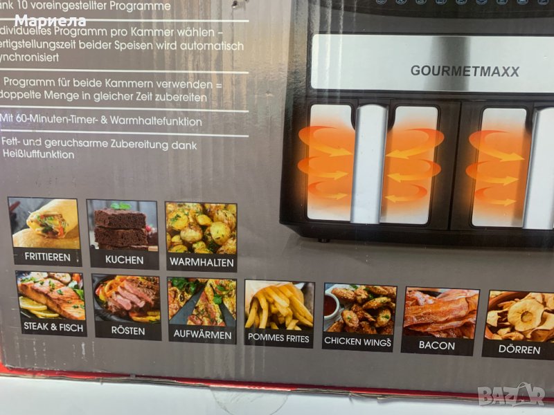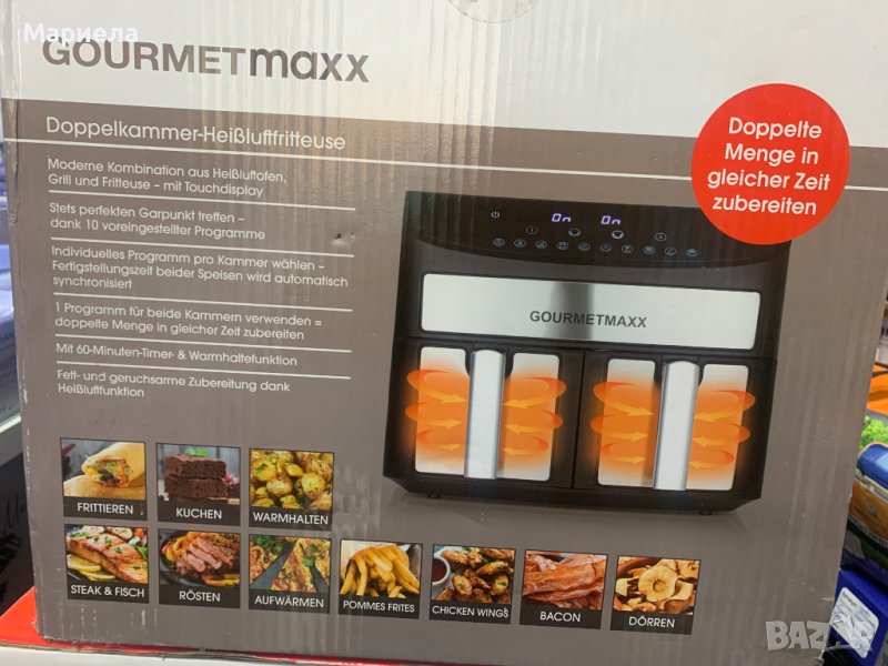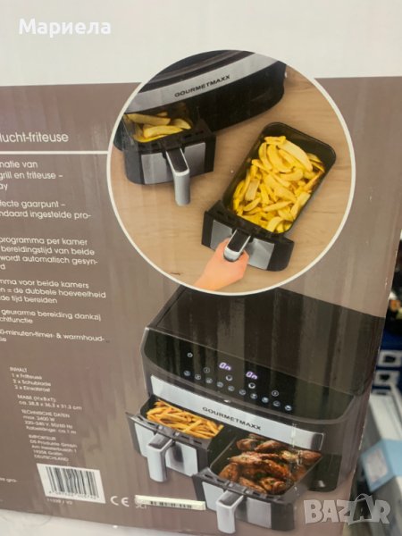 Фиртюрниците са закупени от разпродажба в Германия .Мощност: 2400W.Капацитет на съда за пържене: 3,8 л. X 2 .Съдове за пържене с незалепващо покритие и с подвижни решетки - по 2 бр.Продължителност на таймера: 60 минутиLED дисплей.Сензорно управление.Контрол на температурата: 65-230°C.Нагревателен елемент от неръждаема стомана.Автоматично изключване с предупреждение за готовност .Гумирани крака против преплъзгване .С микропревключвател .Има функция дехидратор .Основен панел и панел за съд за пържене с декорация от неръждаема стомана .Сертификати: GS CE CB ETL.Десет предварително зададени програми.Матова повърхност.Можете да имате най-вкусните ястия на масата за нула време благодарение на горещият въздух и всичко това сготвено по здравословен начин, без да използвате олио или масло.Със своя компактен дизайн той е истинско богатство за вашата кухня.Има функция за едновременно двойно готвене и синхронизиране.В допълнение имате удобните предварително зададени програми .С функцията за двойно готвене можете лесно да задавате настройките за лявата и дясната кошница.Фритюрникът с горещ въздух разполага и с фнкция Shake, която дава сигнал/напомняне да разклатите вашето ястие, което е изключително удобно е!И накрая, имаме функция за синхронизиране, която Ви гарантира,че двете ястия ще бъдат готови заедно.