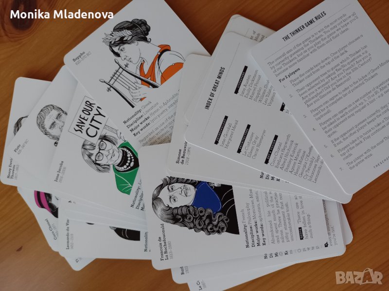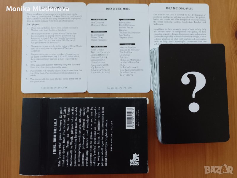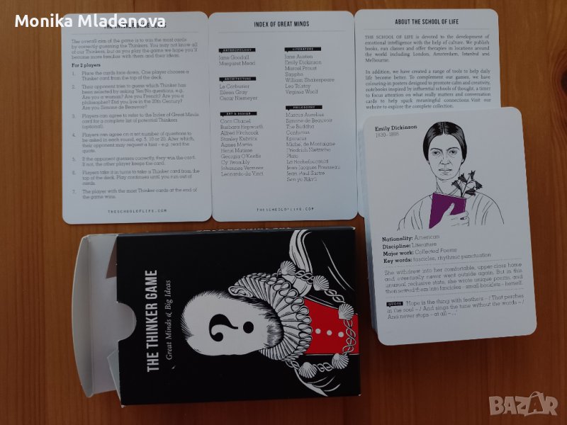 Това е картова игра на The School of Life. Картите включват 52 велики мислители от архитектура, философия, изкуство, антропология, дизайн, литература, политическа теория, психология, наука и социология. Всяка карта предоставя основна информация за конкретната личност, за да помогне на останалите играчи да отгатнат кой велик ум държите в ръцете си. Прекрасен начин да научите нещо ново за едни от най-големите умове, забавлявайки се.