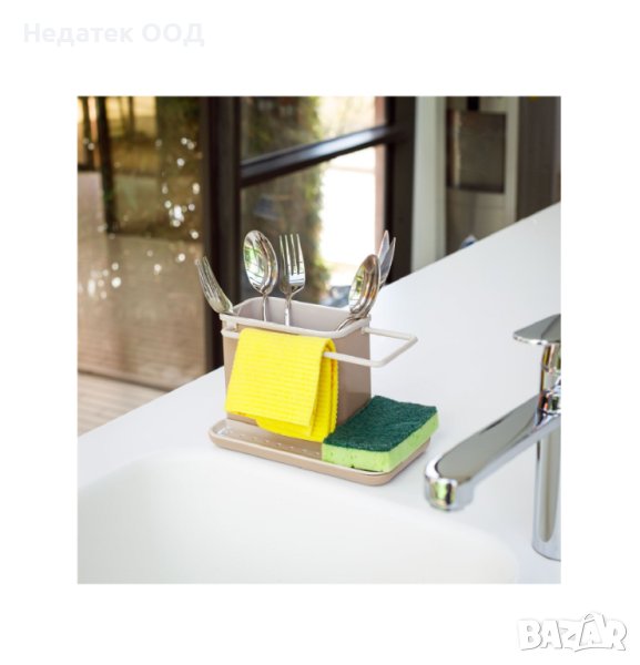 Основа за органайзер за мивка с отделение (13x6.5x13cm) за поставяне на препарата за миене на съдове, повърхност с гъба с отвори за оттичане на водата и отделение за закачане на гъба или кърпа.