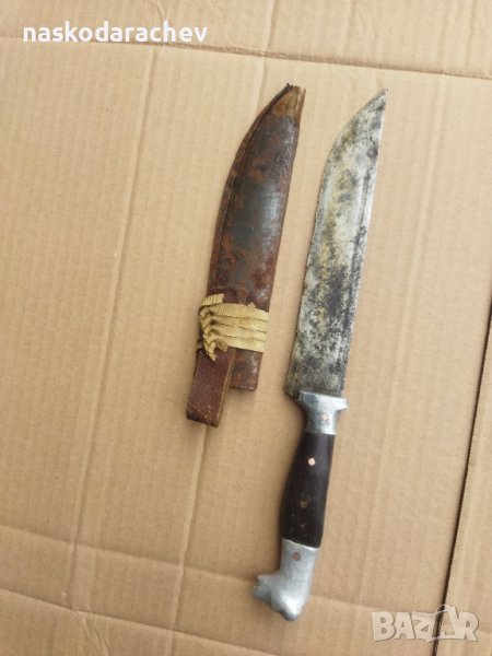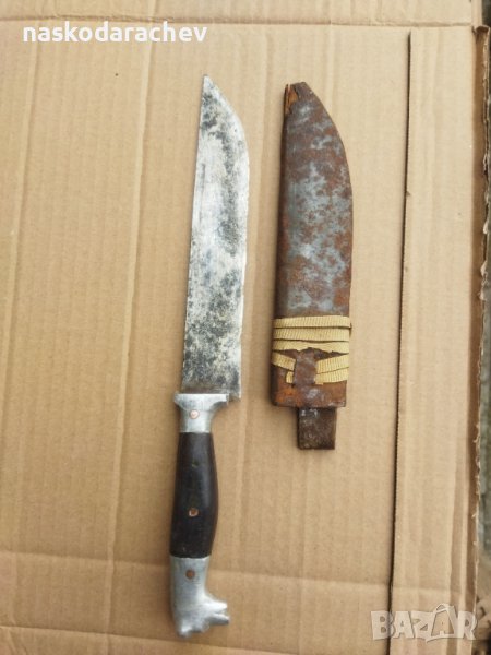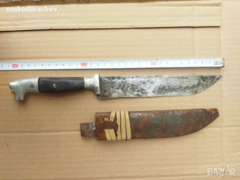 Стар ретро нож с дръжка меча глава, глава на мечка, за колене и дране, колекционерски, ловджийски, овчарски нож, с канали за изтичане на кръвта от двете страни, ножът е лошо съхраняван с калъф в не добро състояние видно на снимките, цена - 120 лв.