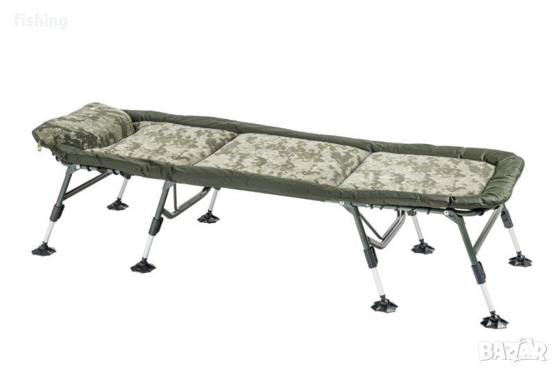 Изключително леко и напълно плоско легло в цифровия камуфлажен дизайн. Дебелият матрак с покритие от руно предлага наистина висок комфорт. Твърдостта може да се регулира чрез усъвършенстваната система за опъване в средната част и допълнителни регулируеми ленти за опъване. Предимство е дългата максимална дължина на регулируемите крака с големи кални лпаи. Лекото кресло Stealth се предлага във версии с 8 и 6 крака.