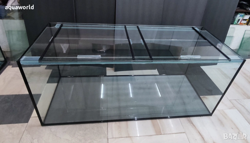 Аквариум с размери 110/35/50 от 10 мм стъкло с машинен кант. Стъклени капаци с пвц водачи и подложка.