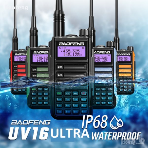 Радиостанцията Baofeng UV-16 ULTRA е водоустойчива със сертификат IP68 ( модела 9r PLUS e с IP67) Много е популярна, особено сред радиолюбителите, играчите на еърсофт, планински водачи, спасители и тн. Предавателят има голяма предавателна мощност от 25 W, LCD дисплей с подсветка в три цвята, 128 предварително зададени канала, възможност за задаване и запазване на имена на канали, обхват до 55 км и дълъг живот на батерията 12500 mAh до 40 часа работа. Можете да свържете слушалки към Baofeng UV-16 Ultra,той има индикатор за изтощена батерия, FM радио (85,0 MHz-108,0 MHz), фенерче и SOS аларма.