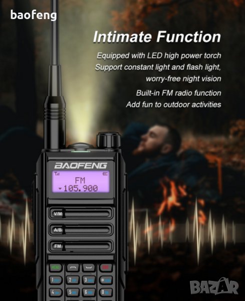 От 2001 г. насам Baofeng е един от най-реномираните китайски производители на радиостанции и радиоприемници. Благодарение на отличното съотношение цена/качество радиостанциите им са много популярни в цял свят, както сред любителите, така и сред професионалистите. Всички радиостанции Baofeng, включително този модел, се предлагат с множество аксесоари още в основния пакет.