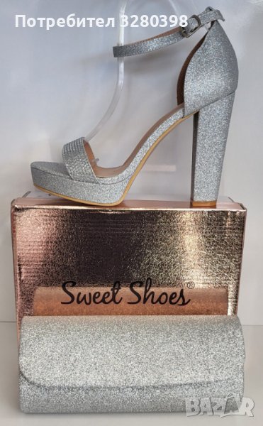 Официални дамски обувки на висок квадратен ток с платформа в сребрист цвят → Обява 44321150