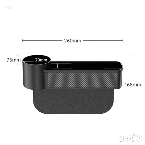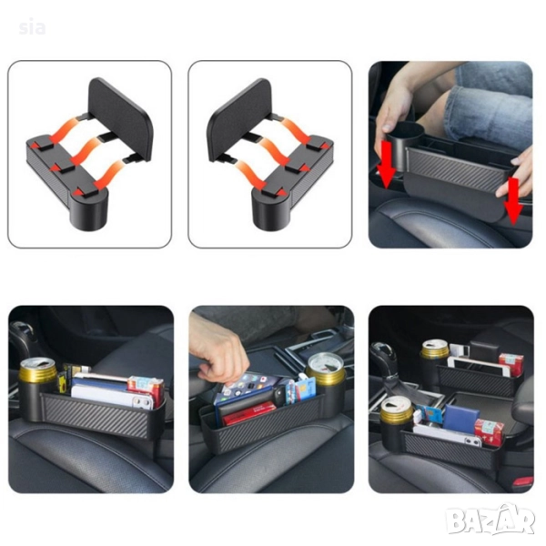Органайзер създаден да пасне между почти всички автомобилни седалки и централни конзоли, този аксесоар ви помага да организирате вещите си в интериора на автомобила. Разполага с отделение за чаша/бутилка и няколко отделения за други предмети – като телефон, слънчеви очила, карти, зарядни кабели и други.