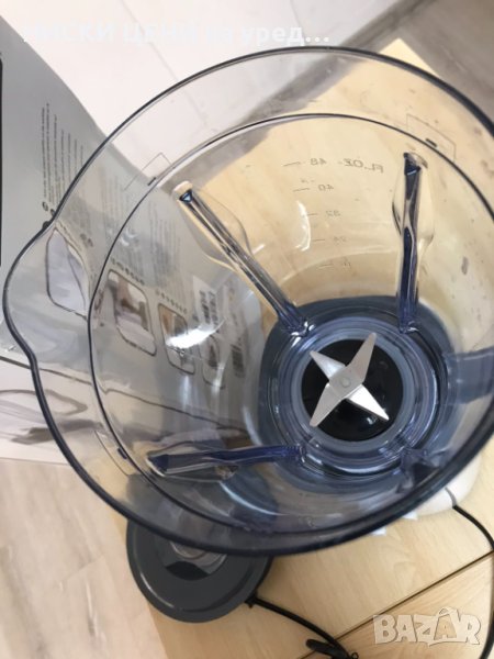 С 2 скорости + импулсна функция, пластмасова кана 1,5 литра, градуирана в ml и oz., система за безопасност. Активен само когато каната е заключена, Отвор за пълнене и филтърна решетка в капака, Подвижни остриета от неръждаема стомана с 4 остриета