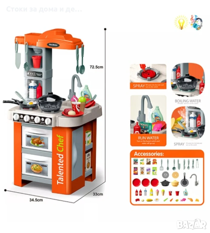 Функции: светлинни ефекти, реална функция течаща вода от крана на мивката, ляв котлон с механизъм за пара - парата не е гореща и е безопасна за деца!