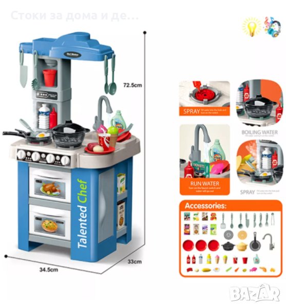 ✨Детска кухня с пара, клокочеща тенджера и мивка с течаща вода (72.5см) - СВЕТЛОКАФЯВА /СИНЯ → Обява 44323920