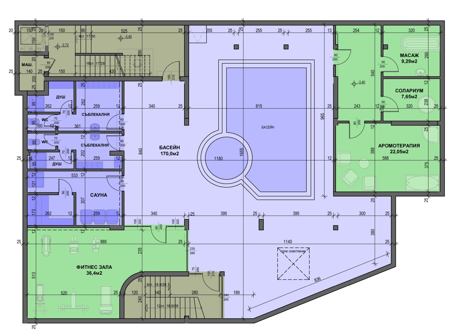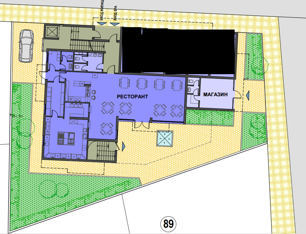 Сутерен:басейн със SPA център, състоящ се от помещения за сауна, фитнес зала, масажен кабинет, стая за солариум, стая за ароматерапия и съблекални. Общата площ на сутеренния етаж е 382.57кв.м. От SPA центъра има излаз чрез вътрешно стълбище на двора. Има площадка пред ресторанта, чиято площ е с право на ползване изключително и само от търговските помещения.