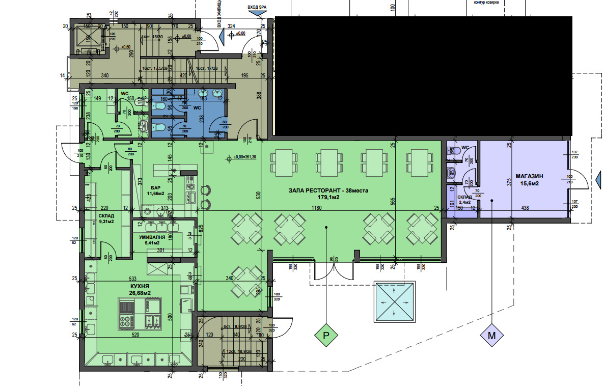 Партер:Ресторант с площ 201.17кв.м., състоящ се от зала с 38 места/179 кв.м. РЗП/; бар,кухня,склад и санитарни помещения. На това ниво има и магазин с площ 30.25кв.м. със самостоятелен достъп към улицата. Общата квадратура на партерните помещения за продажба е 231кв.м.