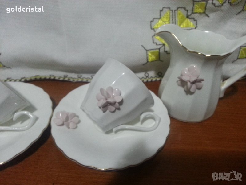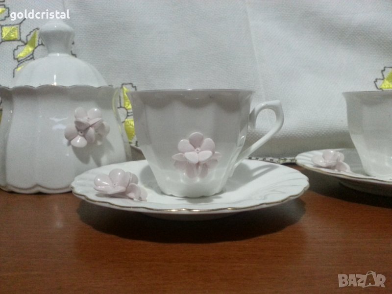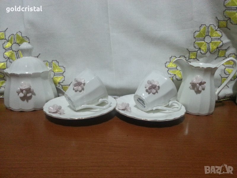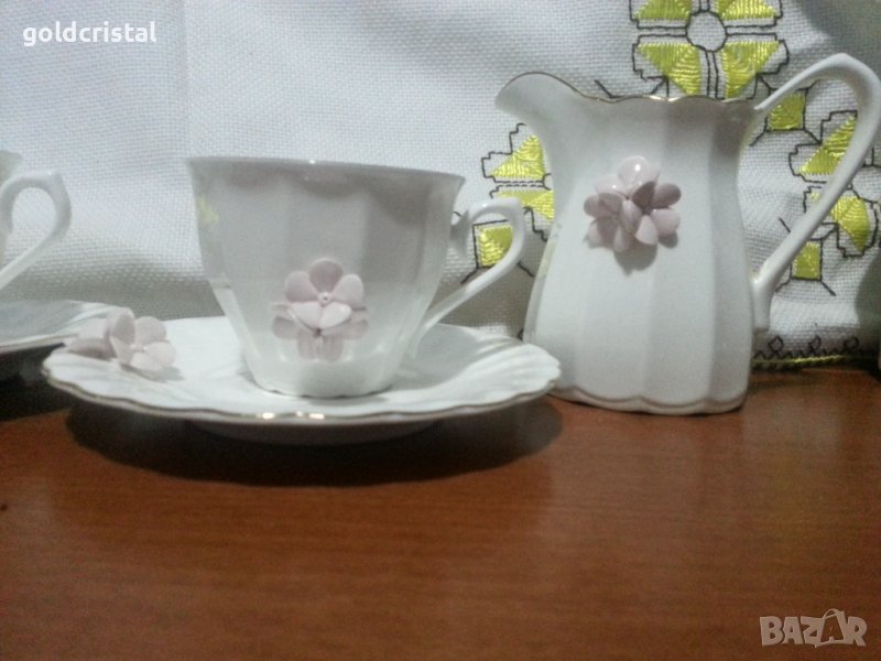 Български костен порцелан Бононя с пластика чашка с чинийка Нона захарница и латиера без забележки с златен кант сервиз комплект сет лот ретро арт декор винтидж колекция стари антикварни предмети обзавеждане за дома и семейството подходящи за подарък за ценители и колекционери