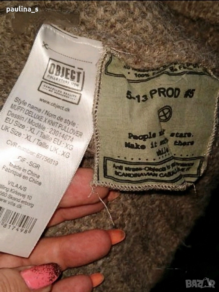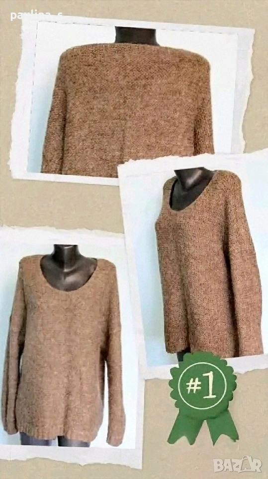 2️⃣ Колаж / 2XL / 5XL / "Object". Цената е крайна 39,99лв / 20 евро. Перфектен пуловер от мохер, мерино, вълна и примеси. Моделът е обран с падащи рамене и О-образно деколте. Купуван е от магазин на бранда в Атина. Плетивото е рехаво и дава еластичност. Има и сериен номер, вече ми е голям и го продавам. Без дефекти, добре стопанисван.
