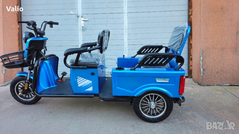 триколка готова за каране.Eлектрическа триколка CARGO – LUX- .Моделът е изключително атрактивен и подходящ за разходка на един или двама пътници.Задната седалка с едно движение се повдига и задната част се превръща в място за товар.Страничната част на задното отделение е със врата,което допълнително допринася за удобното пренасяне на товари.Последен модел на такъв тип триколки – нищо общо с предлаганите подобни на пазара.Изключително функционални, както за града, така и за по-малките населени места.