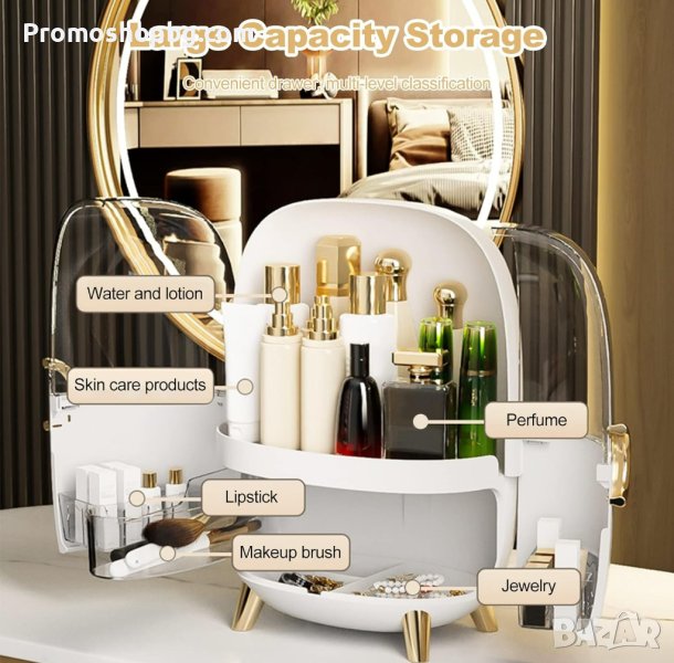 ПРАКТИЧЕН ОРГАНАЙЗЕР ЗА КОЗМЕТИКА, БИЖУТА ИЛИ ДРУГИ АКСЕСОАРИТой е красив, елегантен и много просторен.В допълнение, той е изключително красив и ще служи като декорация на стаята.Характеризира се с просторни чекмеджета и голяма витрина за парфюми, балсами или кремове. Той ще поддържа вашите малки предмети чисти и подредени.Органайзерът е изработен от акрил в модерен цвят, а допълнителни златни елементи придават ексклузивен вид на продукта. Прозрачният капак ви позволява лесно да намерите необходимата козметика.Характеристики на продукта:Материал: АкрилДоминиращ цвят: бялШирина: 27Височина: 36Дълбочина: 18Материал: АкрилЩе бъде идеален за подарък.Кажете сбогом на разхвърляния плот и поддържайте аксесоарите си за красота свежи и чисти, докато постигате безупречен грим всеки ден.Характеристика:ВИСОКОКАЧЕСТВЕН МАТЕРИАЛ: Този органайзер за грим е изработен от висококачествен ABS и PC материал.ГОЛЯМ КАПАЦИТЕТ: Може да съхранява козметични артикули с различни форми и размери и да ги поддържа спретнато организирани.ПРОСТОРЕН И ЛЕСЕН ЗА ПОЧИСТВАНЕ: Побира се на тесни тоалетки, малки плотове за баня или тесни тоалетки, като заема минимално място. Може да се измие директно с вода или да се избърше с мокра кърпа.ПЕРФЕКТЕН ПОДАРЪК: Този многофункционален органайзер за грим е чудесен начин да организирате вашите бижута или козметика. Перфектен подарък за майка, приятелка, дъщеря и др. Идеален за рождени дни, Коледа, Нова година, Свети Валентин, Ден на майката и различни други поводи.Забележка: Поради разликата в настройките на светлината и екрана, цветовете на артикула може да са малко по-различни от снимките. Моля, позволете лека разлика в размерите поради различни ръчни измервания.Спецификации:Материал: пластмаса, ABS и PCЦвят: БялТегло: 1,7 кг