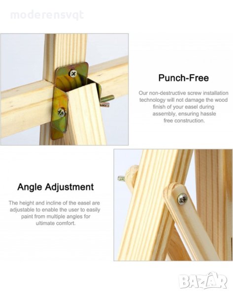 Стативът за рисуване е изработен от висококачествена букова дървесина и се сглобява лесно и бързо. Идеален е за ползване от всеки професионален художник или любител, благодарение на стабилната конструкция с регулируема височина, като максималната височина на платното е 105 см. Ъгълът, както и държачът за платно също могат да се регулират.