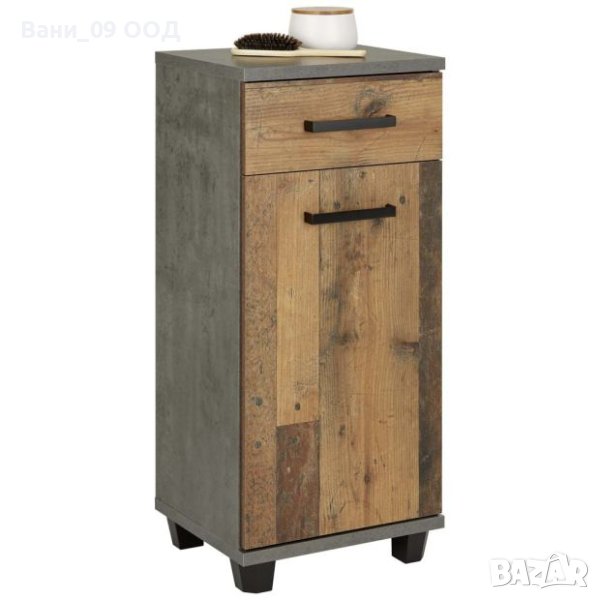 шкаф за баня с размери Ш:40.2/Д:34.8/В:90.8 см. Артикулът, освен че ще придаде завършек на банята, ще осигури и допълнително пространство за съхранението на хигиенни препарати, кърпи, четки и др. вещи в мокрото помещение. Разполага с едно практично чекмедже, както и отделение с една врата на панти, зад които е монтиран един регулируем рафт. Корпусът на шкафа е декориран в сив цвят (бетон), а вратичките в различни дървесни текстури, създаващи приятна винтидж атмосфера.