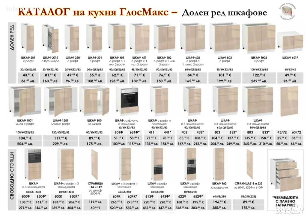 Шкафове Долен Ред Визон - Страница 218/58 см, Колонен шкаф за вграждане на хладилник 982, Колона за фурна 652Ф*, шкаф 1001 за ъгъл, шкаф 602 с 1врата за мивка, врата 60 С за миална за вграждане на 60 см, шкаф 602 за котлони.