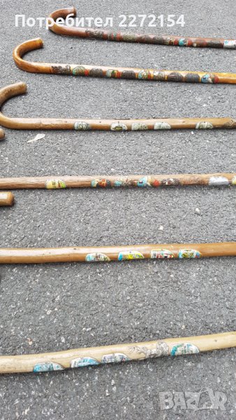 Всичките са здрави и годни за ползване. Долу са с метални накраници,само на един липсва. Имат значки,някои повече ,други по малко,това зависи колко върхове са изкачили. Най късият е 85 см,най дългият 95 см,останалите по между тях. Цената им е за всичките и е крайна.