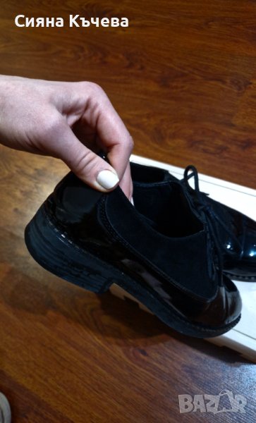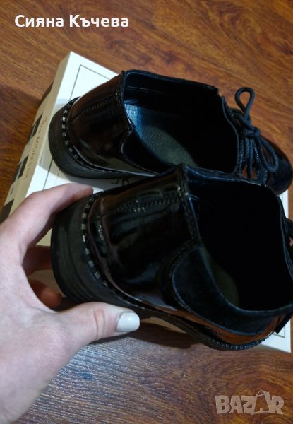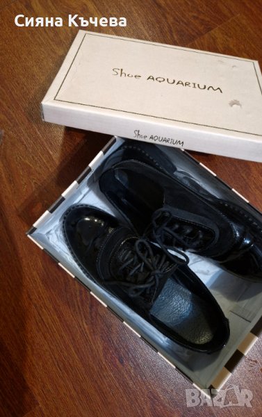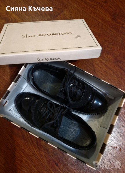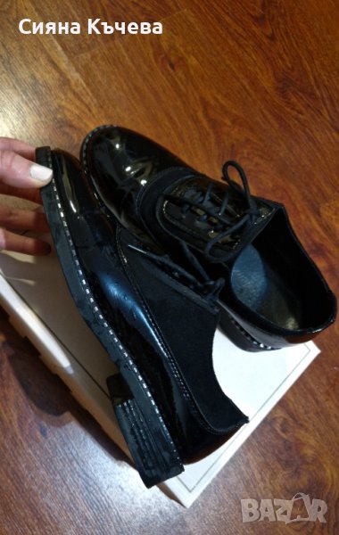 Дамски обувки с връзки от естествена кожа, и лак. Мека удобна вътрешна стелка. Красиви бляскави елементи в долна част на подметката. Обувките са като нови носени са 2 пъти. Цената на която са закупени е 99лв, продавам ги за 49лв. Номер 38.