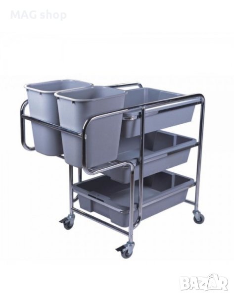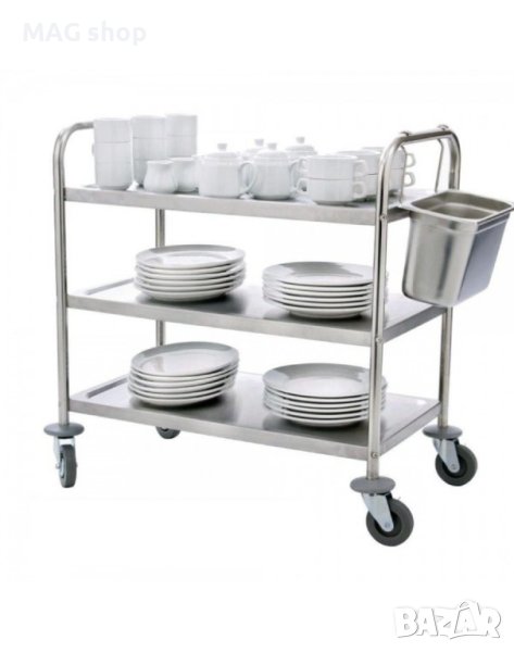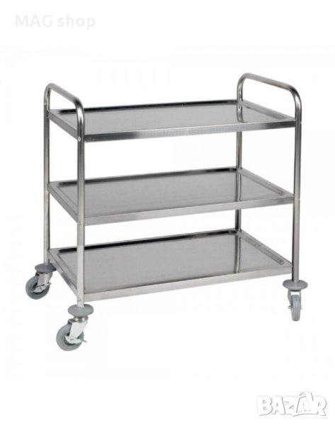 Количка за сервиране от неръждаема стомана , идеална за хотели, ресторанти, столови и други заведения за хранене. Лесна за маневриране, с дръжки от двете страни.