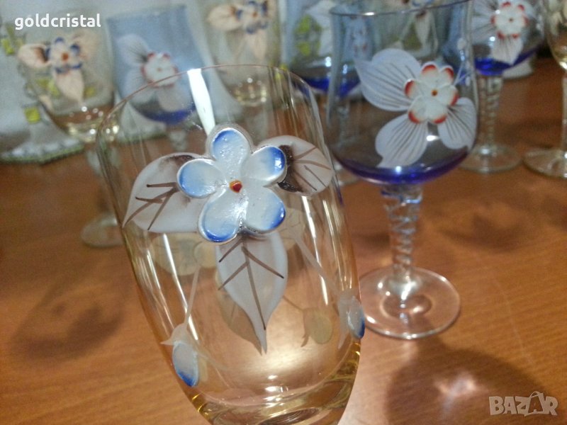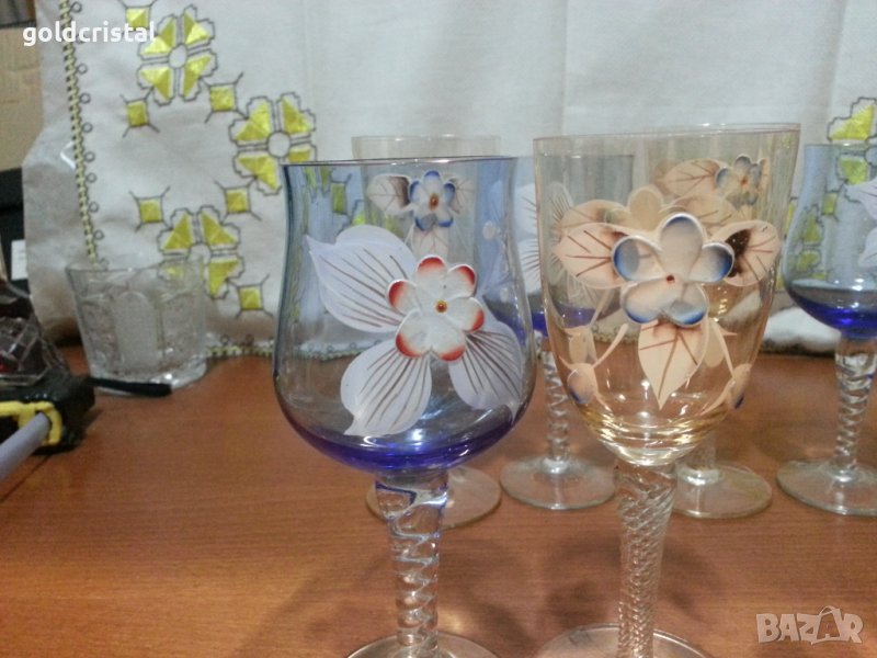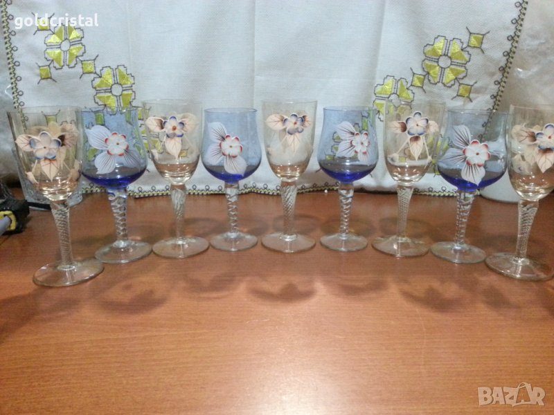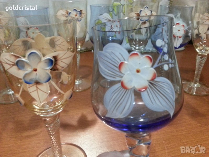 Ретро стъклени чаши Бохемия ръчно рисувани художествена пластика цветно стъкло 9 броя без следи от ползване сервиз комплект сет лот ретро арт декор винтидж колекция стари антикварни предмети обзавеждане за дома и семейството подходящи за подарък за ценители и колекционери