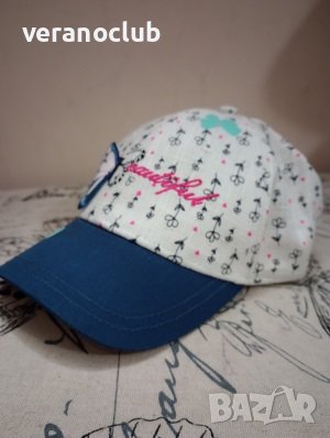 Пеперудена шапка с козирка за момиче на възраст 4 - 8 години. Шапката е от памучен фин плат и е подходяща за летните месеци от годината. Размерът на шапката е 50 см и означава обиколката на главата на вашето момиче в сантиметри. Шапката е в бял цвят и има синя козирка. Отзад размерът може лесно да се регулира чрез прилепваите се ленти.