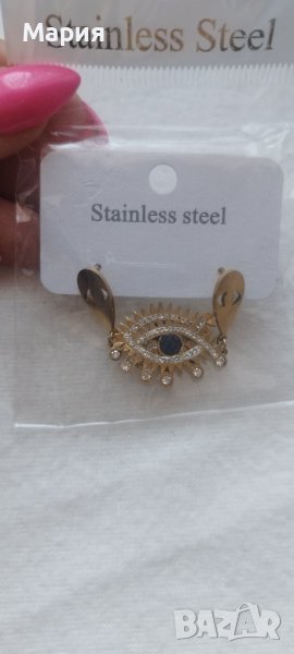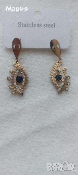 Модерен комплект от стомана - обеци и колие с талисмани и окото на Фатима против уроки, позлатено.