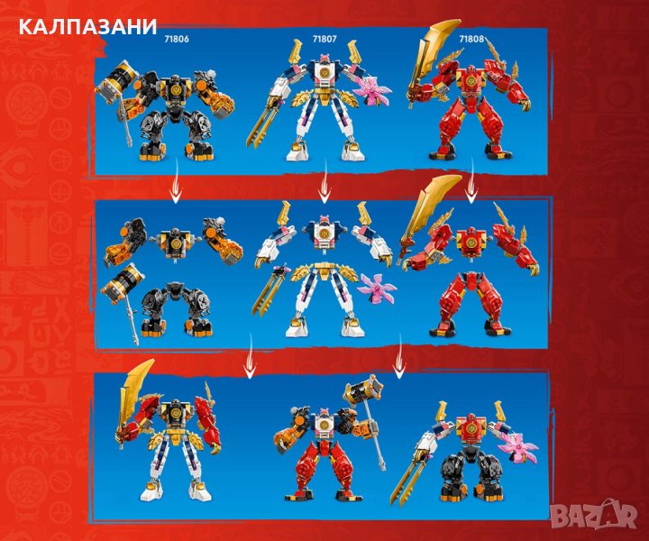 - Постройте собствен робот – феновете на играчките с нинджи могат да се насладят на часове творческо забавление, докато комбинират части от екшън фигурите (комплектите се продават отделно), за да създадат собствена фигура на робот
