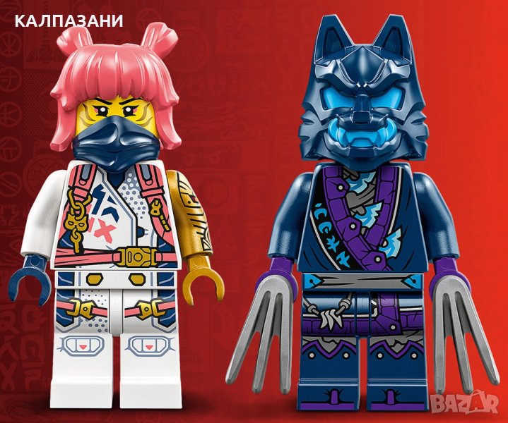 - 2 минифигури от NINJAGO® – комплектът се предоставя със Сора и нейните 2 меча катана и ноктест воин с маска на вълк, така че децата да могат да пресъздават битките от сезон 2 на телевизионното шоу NINJAGO Dragons Rising