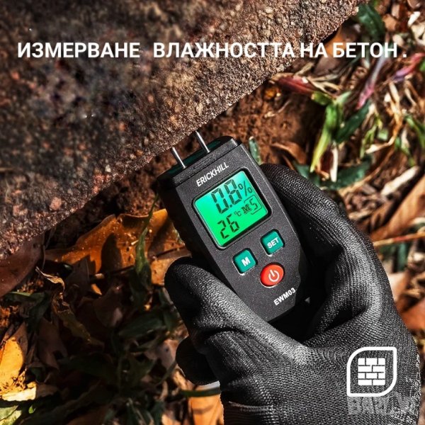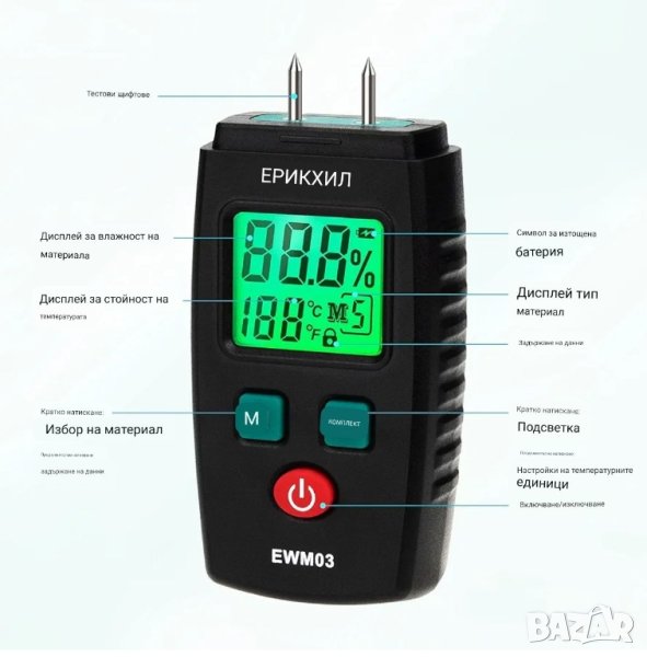 ВЛАГОМЕР ERICKHILL Щифтов влагомер за дърво и строителни материали с 5 режима, LCD дисплей със зелена подсветка, детектор за мухъл в дърво и строителни материали !