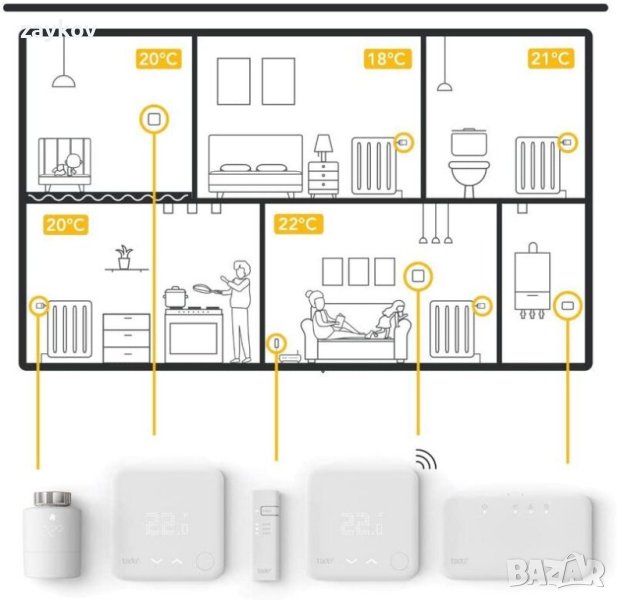 Регулира температурата според локалната прогноза за времето и сигнализира за отворени прозорци.
