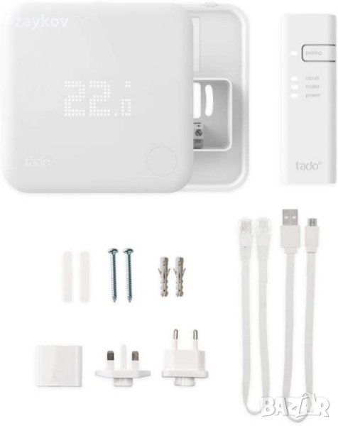 Стартов пакет от tado° смарт термостат за централно или подово отопление и tado° Internet Bridge, който го свързва с мрежата.